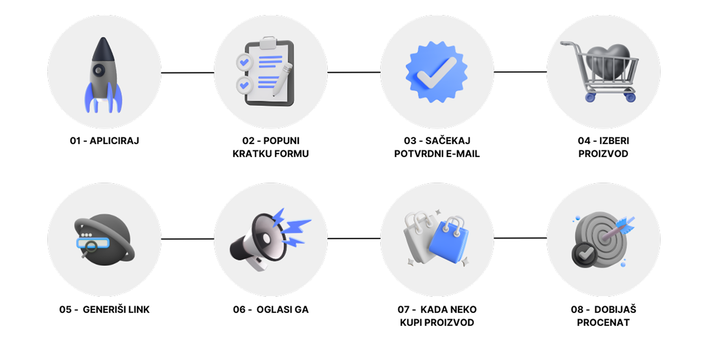 Zarada u potpunosti zavisi od tebe. Biraj način na koji ćeš promovisati proizvode. Od svake prodaje, zadržavaš unapred dogovoreni procenat.